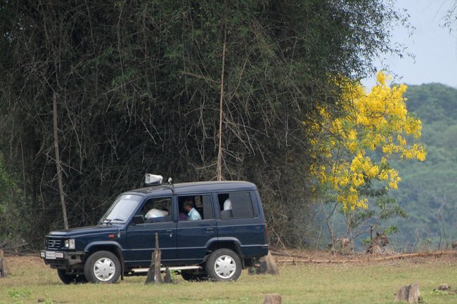 This was photographed from a resort boat on safari in the Kabini backwaters. A police vehicle was very close to a tigress resting at the edge of the forest cover and it looked like the occupants of the vehicle were unaware of the tiger’s presence!