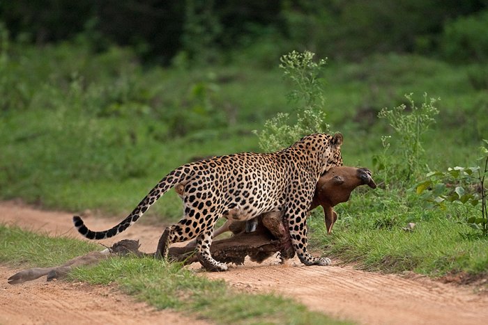 I had heard about this leopard with a gaur calf kill 3 days prior to making this image. The leopard was unable to carry the kill atop the tree because of its size. The kill lay vertically beneath the tree but no one saw it till the leopard got down from the tree and dragged the kill to other side of the game track. Inspite of multiple days of feeding the kill was still massive in size relative to the leopard. It was an amazing natural history sight!