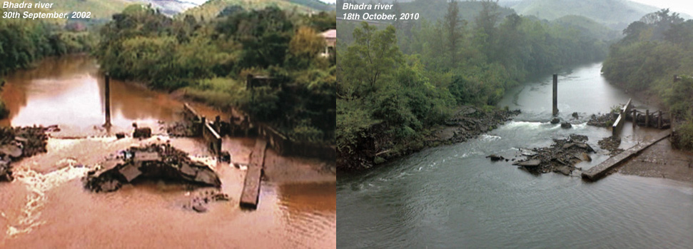 The picture of the Bhadra River on the left loaded with silt after a heavy rainstorm was taken on 30th September 2002, during an inspection by the Central Empowered Committee (CEC) as ordered by the Supreme Court. The photo on the right, showing the clear waters of the Bhadra River was taken on 18th October 2010, again after a heavy rainstorm, from the same location, five years after mining was stopped by the Apex Court based on a petition filed by Wildlife First. The photographs speak for themselves. With no fresh ground being broken for mining the waters of the river are crystal clear once again. You can read more about the campaign that saved Kudremukh here.